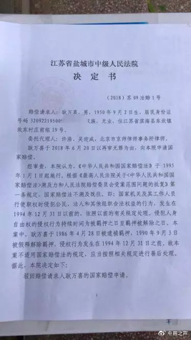 判了刑、坐了牢,而這些都被司法機關確認是錯誤的。耿萬喜說,難道,二三十年前被錯判,就不應該得到賠償嗎?耿萬喜接受中國之聲採訪時還表示,最近將會向江蘇省高級人民法院賠償委員會申請國家賠償。