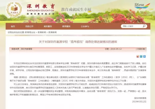 5月12日,深圳市教育局網站發佈《關於對深圳市富源學校「高考移民」調查處理進展情況的通報》(以下簡稱《通報》)。指出:經查實,深圳市富源學校2019年高考報名考生中,有32名考生屬「高考移民」,弄虛作假獲取廣東省報考資格。將取消此32名考生在深圳市的高考報名資格。
