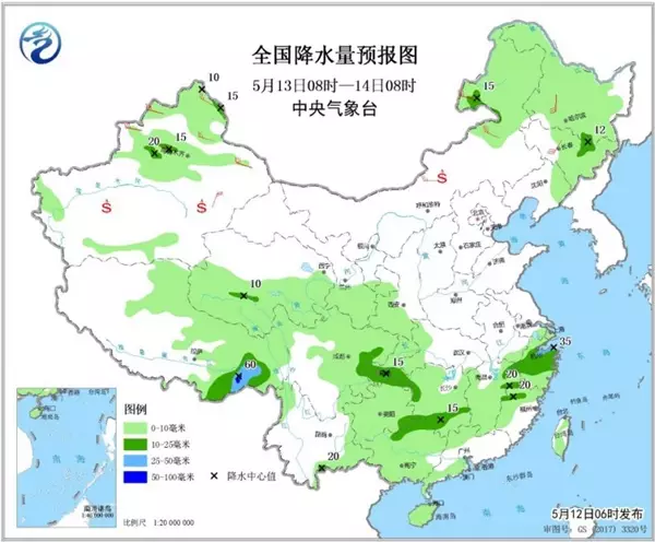 13日08時至14日08時,新疆北部山區和沿天山中部、青海南部、內蒙古東部、黑龍江南部、吉林北部、西藏東南部、西南地區東部、湖南南部、浙江大部、福建西北部、廣西北部等地的部分地區有中到大雨,其中,西藏東南部局地有暴雨(50~60毫米)。