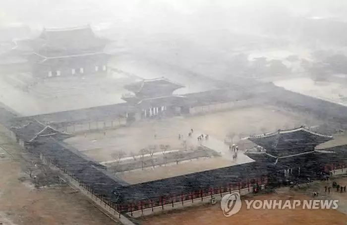 南韓首爾早上一度出現風雪天氣,旅遊景點景福宮,猶如墮入迷霧中,美不勝收。