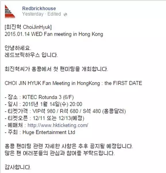 崔振赫的經理人公司Redbrickhouse在官方facebook公布,崔振赫將於明年1月14日晚上八時首次在香港舉行粉絲見面會。公司預計本月11或13日開始售票。