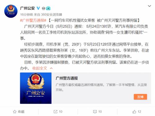 廣州天河警方今日(5月25日)通報: 5月24日13時許,某汽車有限公司負責人陪同其一名員工李姓司機到東站派出所,協助調查「網傳一女生遭司機騷擾」一事。