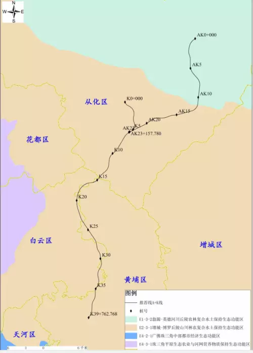 項目推薦路線一期工程(K線)起點位於大廣高速與佛清從高速相交的中和里互通北側,路線向南穿越後龍山,跨花乾渠和流溪河。在神崗二中和菜地塱村之間穿過,上跨廣州地鐵 14 號線、G105(廣從公路)。在從化廣東動漫城與鄧村之間穿過,沿鄧村南側的低山行進,上跨省道 S118,後跨越北三環高速公路。沿西北西南側繞避中新知識城規劃中心區域,跨 S378 和地鐵 14 號線知識城支線,向西行進,繞開添利電子科技公司,折向西南,在石古嶺和西元庄西側穿過,進入南側丘陵區。在蓮塘村西側跨 S115,後跨花莞高速公路,再往南經帽峰山山田水庫東側,過廣河高速公路,經興豐垃圾填埋場東側,至項目終點北二環高速長平互通。路線全長 39.763公里。