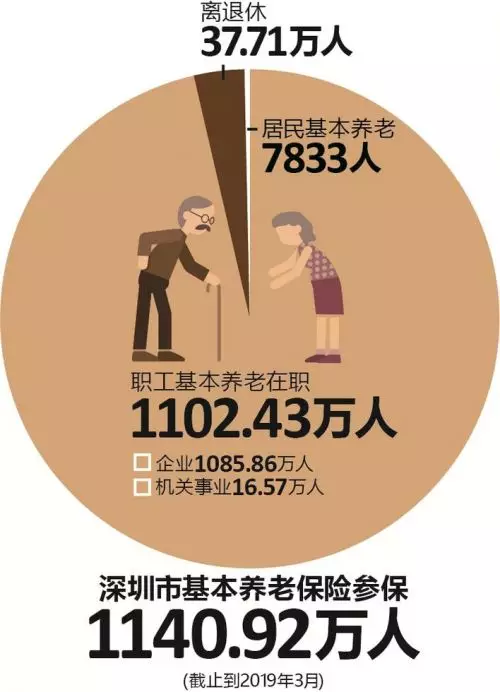 截止到2019年3月,深圳市基本養老保險參保1140.92萬人。其中,職工基本養老在職1102.43萬人(企業1085.86萬人,機關事業16.57萬人),離退休37.71萬人;居民基本養老7833人。