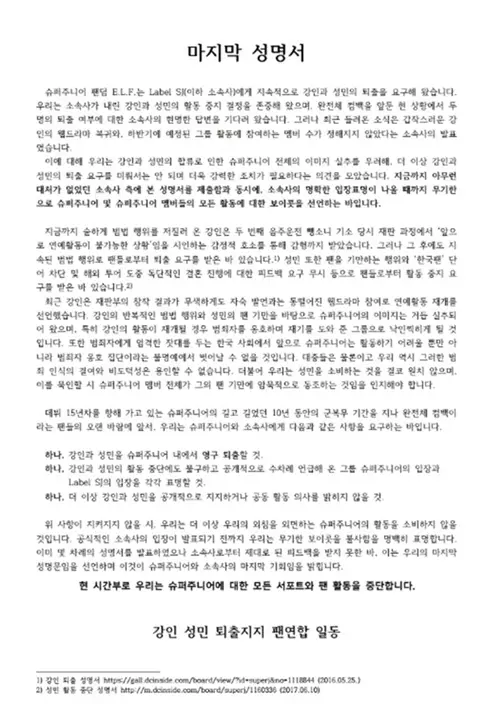 昨日Super Junior的所屬社宣佈組合將會以9人形式活動,成員強仁和晟敏則不會回歸組合,只會繼續作個人活動。不過這樣的安排有些粉絲似乎仍不滿意,因爲強仁和晟敏都分別因爲一些原因深深傷害了粉絲以及團隊的聲譽,於是粉絲認爲兩人不能夠在繼續留在組合,並發表最後聲明要求兩人退出。