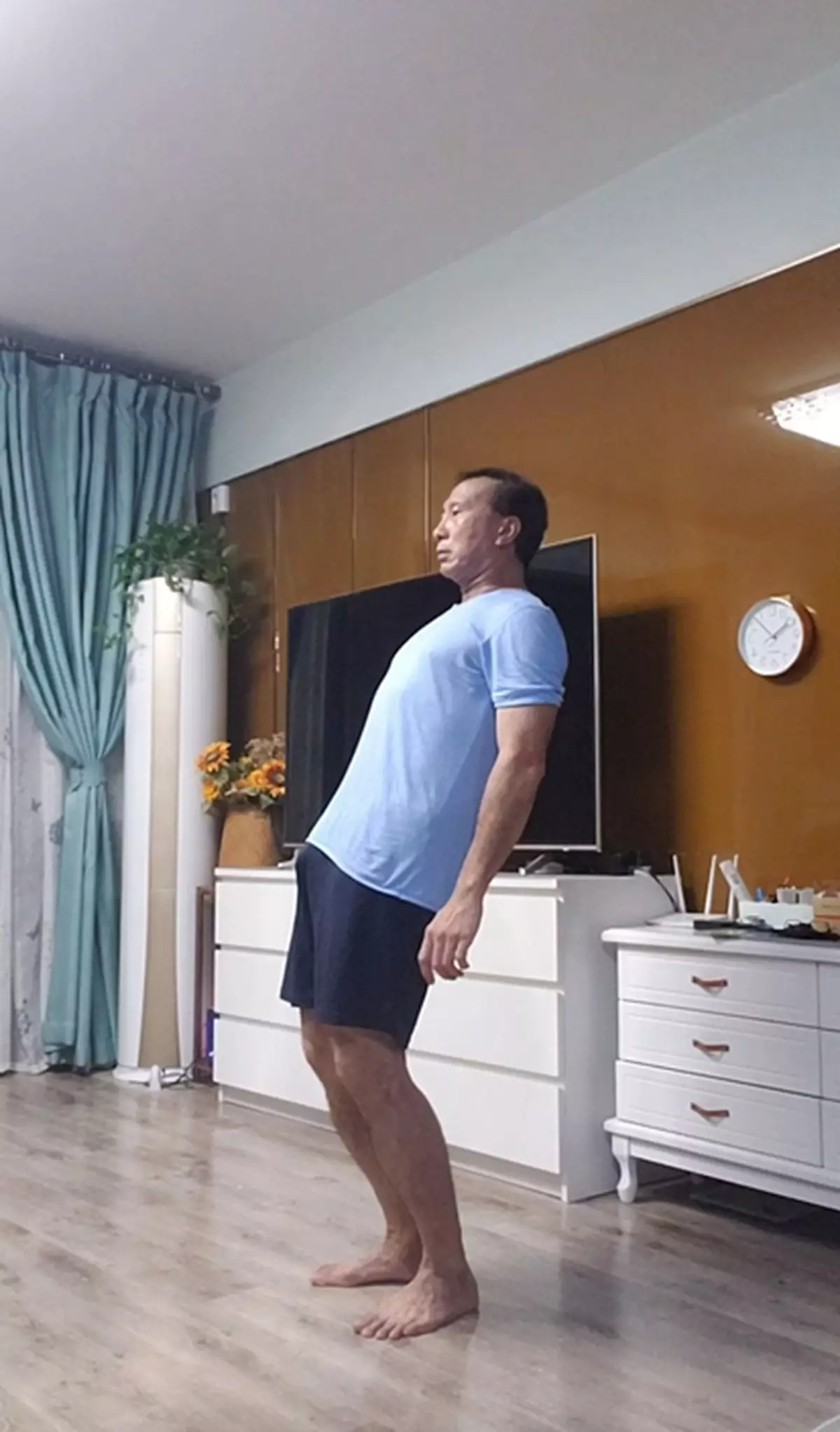剛才一樣站立姿勢,雙手垂下,保持收腹,身體後仰,到適當又能夠平衡位置,在收腹狀態,把腹肌擠在一起收緊,自然呼吸,保持十秒鐘。