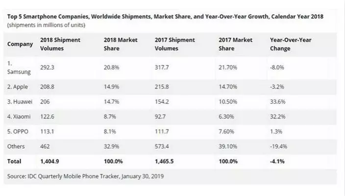 IDC統計2019年全球5大智能手機廠商的市場份額。