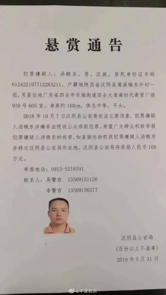 2018年10月7日漢陰縣公安局依法立案偵查,犯罪嫌疑人湯曉東涉嫌非法吸收公眾存款犯罪。希望廣大群眾積極舉報犯罪嫌疑人湯曉東的線索。如直接協助抓獲犯罪嫌疑人湯曉東並移交漢陰縣公安局所在地,漢陰縣公安局將獎勵人民幣100萬元。
