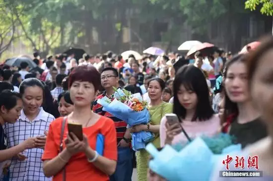 資料圖:家長捧著鮮花在考場外等候孩子出現。 王以照 攝