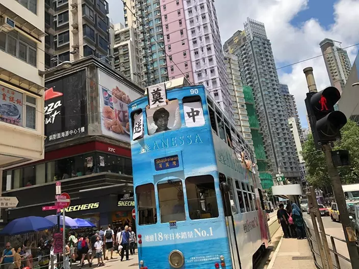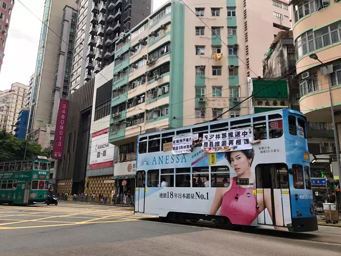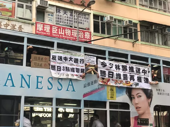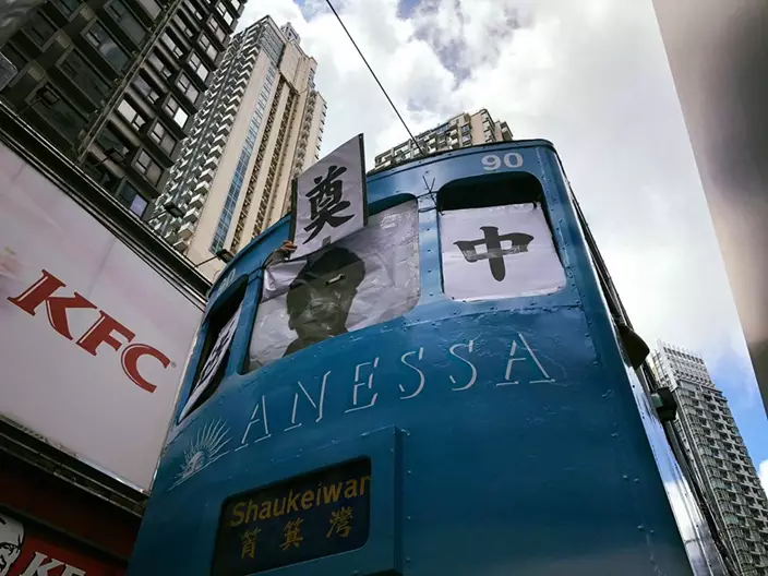《逃犯條例》修訂引起社會極大爭議,民陣明日發起反對修訂的遊行。遊行前夕,有市民在港島發現一輛「反送中號」電車,有乘客在車頭舉起「送中」紙牌,中間放上特首林鄭月娥的圖片,有人舉起「引渡送中,司法送終」的紙牌。