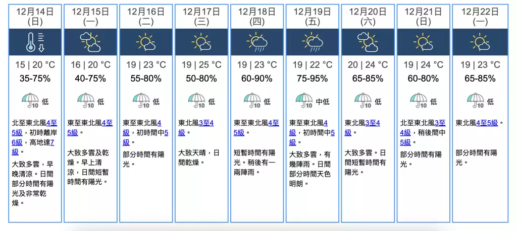 天文台表示,強烈東北季候風正影響廣東沿岸地區,預測周日大致多雲,初時有一兩陣微雨,日間部分時間有陽光及非常乾燥,最高氣溫約20度。