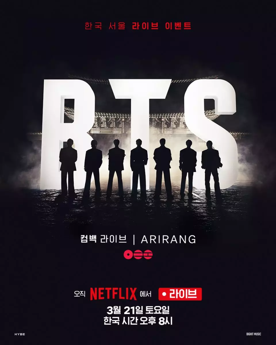 全球ARMY(BTS粉絲名稱)引頸期盼,2026年流行樂壇的震撼重磅消息,防彈少年團(BTS)終於以完整七人體回歸,Netflix方面在3月5日正式釋出《BTS THE COMEBACK LIVE | ARIRANG》官方預告片與主視覺海報,並宣布將於3月21日(週六)韓國時間晚上8點(香港時間晚上7點),透過Netflix獨家向全球直播這場世紀級回歸演唱會。這不僅是BTS全體成員完成兵役後的首次完整體專場演出,更是他們全新音樂篇章《ARIRANG》的盛大開啟,象徵著「韓流之王」的強勢歸來。