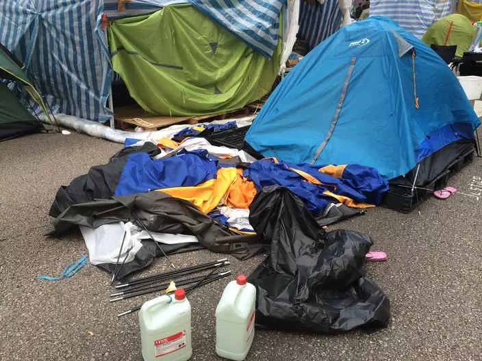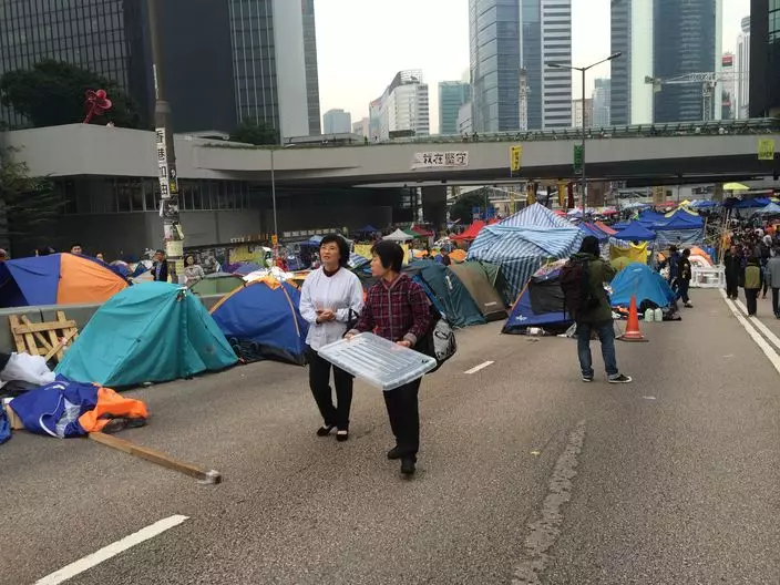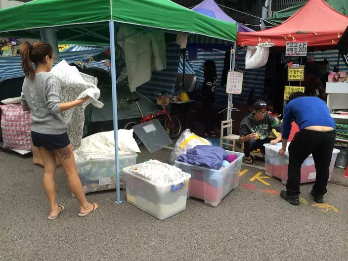 經歷佔領區的「最後一夜」後,昨天清晨,不少佔領者起床後,收拾細軟撤離,物資站義工亦呼籲示威者「夠鐘就走」,氣氛平靜。多個物資站義工亦將物資由金鐘夏慤道,搬往灣仔方向撤離,部份物資會先運到義工的家中,再等候指示處理。