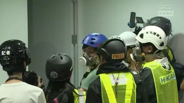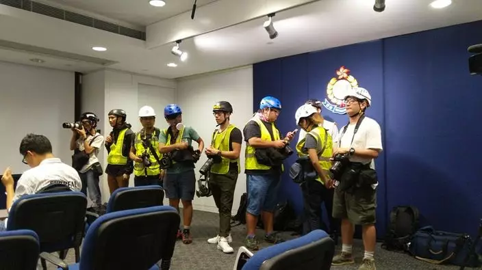 有記者及攝影師身穿反光衣、戴頭盔和眼罩出席記者會。(香港電台視像新聞 RTHK VNEWS 圖片)