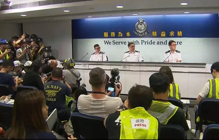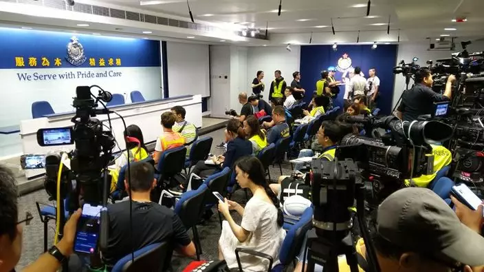 警務處處長盧偉聰在警察總部,就昨日金鐘一帶激烈衝突召開記者會,在場部份記者及攝影師身穿反光衣,戴上頭盔和眼罩出席。