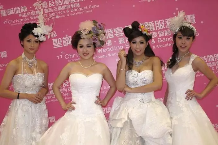 女子組合FFx四位靚女穿上低胸婚紗出席會展婚紗展,她們說行過幾次婚紗騷,但不會感覺麻木,因為每次造型都不同。