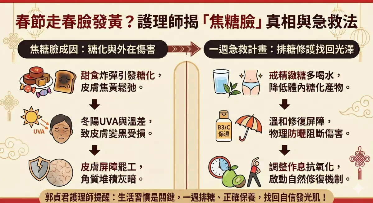 許多女性在春節出行時,常面臨精心妝容不到半天就呈現蠟黃脫妝的窘境。台灣資深護理師郭貞君指出,這並非單純因為疲勞,主因在於攝取過量甜食引發的「糖化反應」,讓皮膚像被糖漿漬過的棉花糖。建議透過「一周排糖 、精簡保養、精準防曬」,即可在開工前找回肌膚光澤。