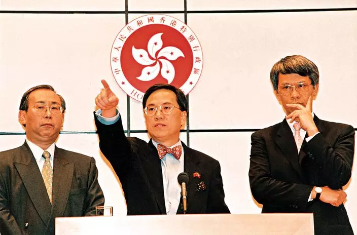 許仕仁(圖左)和曾蔭權(圖中)及任志剛(圖右) 在金融風暴中,動用外匯儲備入市擊退炒家。