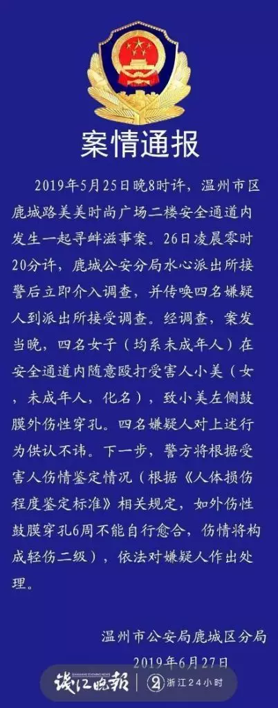 6月27日凌晨,溫州鹿城警方發佈通報,確認5月25日晚8時許,溫州市區鹿城路美美時尚廣場發生一起尋釁滋事案。