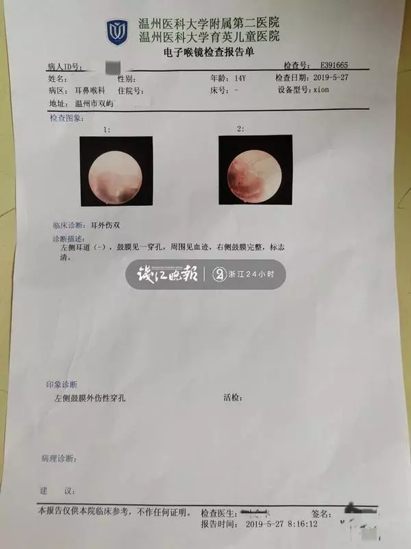 當晚,氣憤至極的朱女士開車帶女兒去醫院,醫生鑒定小玉為左側鼓膜外傷性穿孔,耳朵里還有血跡。