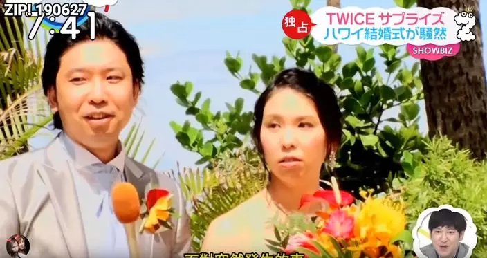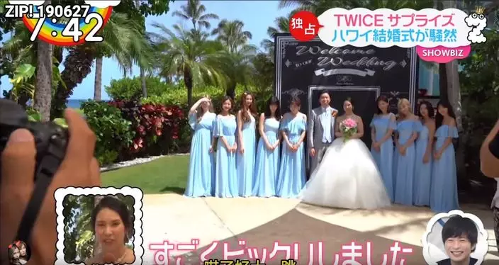 終於等到TWICE出現,所有賓客都露出驚喜表情,相反新娘一臉平淡。但新娘其實内心超激動,她事後受訪時表示:「太驚嚇以致說不出話來,真的成為一個無法忘記的典禮了。」