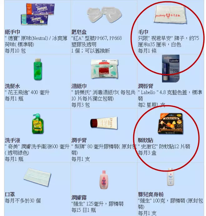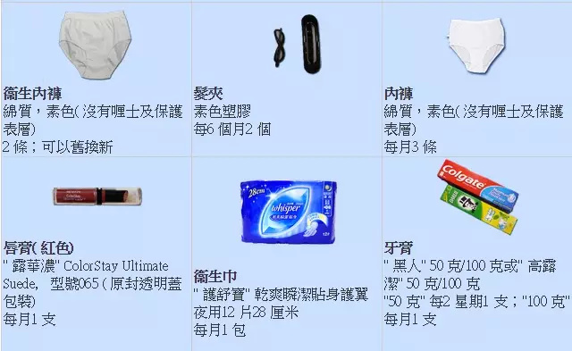 另外各類可帶入監的生活用品都有規定,例如毛巾當然係國產名牌「祝君早安」啦。驅蚊貼就係「史激它」牌子。女犯用品更人性化少少,衞生巾係「護舒寶」 乾爽瞬潔貼身護翼夜用裝,仲可以用「露華濃」 ColorStay Ultimate Suede紅色唇膏(其實坐監用唇膏嚟做乜?)
