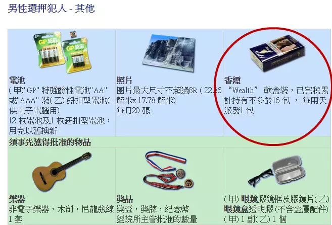 吓,乜嘢嚟架? 原來係咁,監獄當然無香煙供應,好多嘢由探監親屬提供。但唔係乜嘢都可以帶入去,懲教署定晒所有可以帶俾犯人的生活用品准許的牌子,香煙就係呢隻「Wealth」牌啦,寫明是「已完稅累計持有不多於16 包 ,每兩天派發1 包」,即係一日得半包,想食多啲都無。