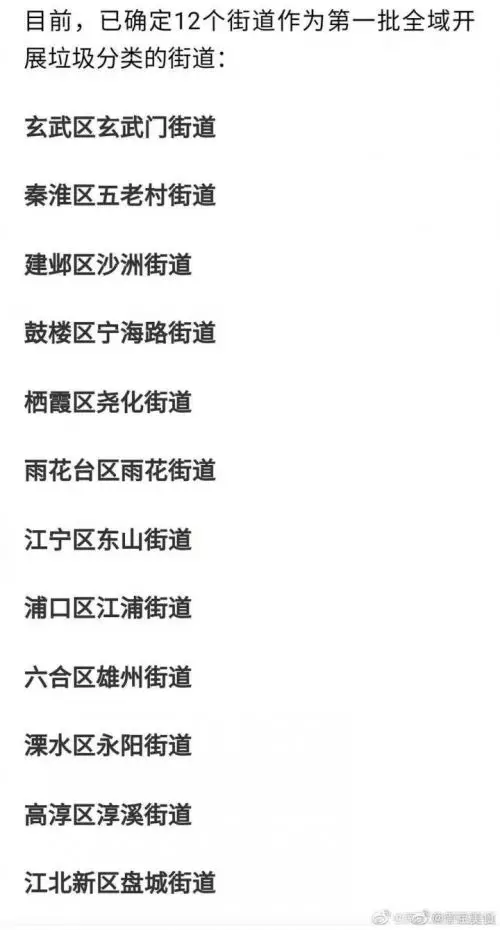 南京市城管局環衛處主任科員龍瑞表示,這是2018年南京確定的第一批全域開展垃圾分類的街道,並不是最近出來的名單。