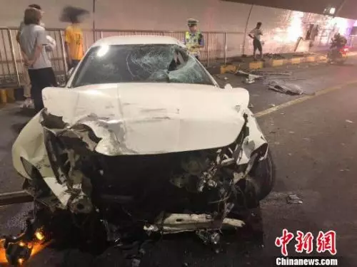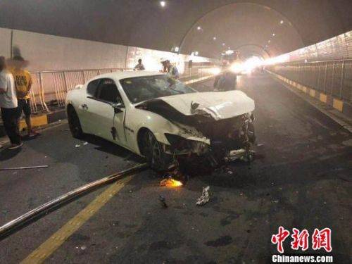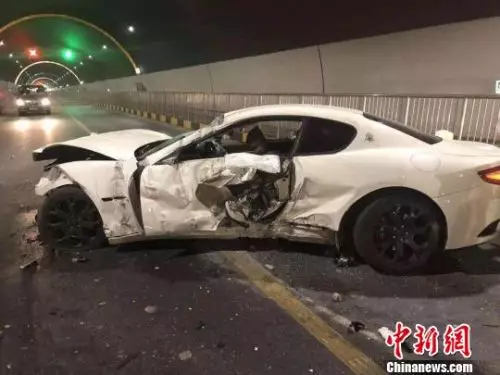 接警後,民警立即趕到現場。只見現場一輛白色瑪莎拉蒂轎跑受損嚴重,車頭面目全非,車內安全氣囊全部彈了出來,前擋風玻璃破碎,左側車身被撞得凹陷進去,整輛車子幾近報廢。邊上的護欄也被撞壞一部分,地上散落了許多護欄以及汽車零部件。