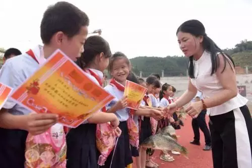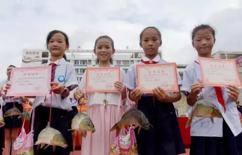 老師在給獲獎學生髮放鯉魚。新華社發(龔普康攝)