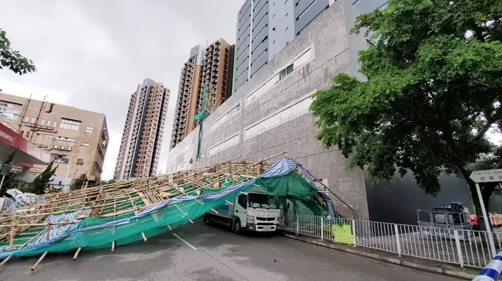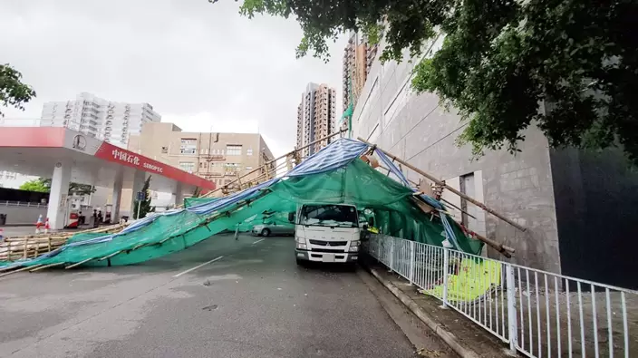 十號颶風猛烈吹襲下,本港多處地方強風暴雨,多個棚架欲墜甚至墮下。9月24日凌晨4時45分,何文田窩打老道一幅面積大型棚架疑受強風吹襲搖搖欲墜。