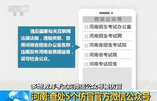 央視新聞訊 日前,河南省網信辦發佈公告,稱在高考志願填報期間已查處多個仿冒招生考試院名義的微信公眾號。