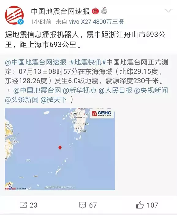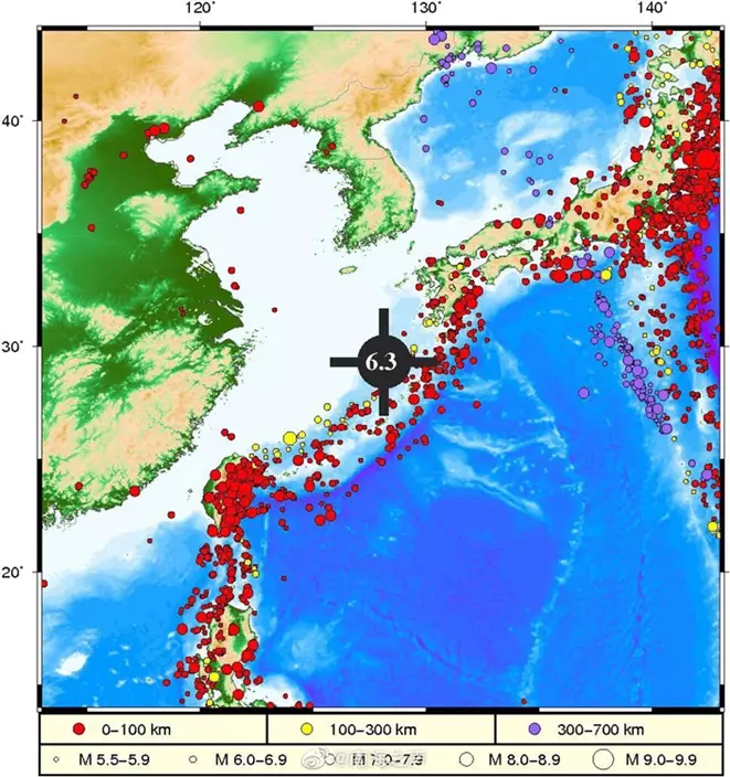 中國地震台網正式測定,今早08時57分在東海海域發生6級地震,震源深度230千米。暫未傳出傷亡報告。