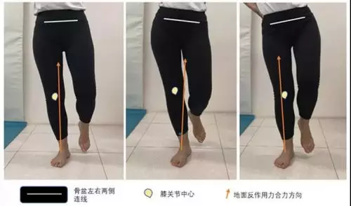 3種常見步態分別是:一、骨盆水平,地面反作用力合力方向朝向膝關節中心內側,沒有超過身體中線;二、對側骨盆下沉,地面反作用力合力方向朝向膝關節中心內側,膝關節內收趨勢明顯增加,同樣體重情況下,這種步態姿勢可能增加膝關節骨性關節炎的風險;三、對側骨盆抬高,地面反作用力合力方向朝向膝關節中心外側,軀幹側傾向支撐側,膝關節有外翻趨勢,這是膝關節韌帶和軟骨損傷的常見動作。