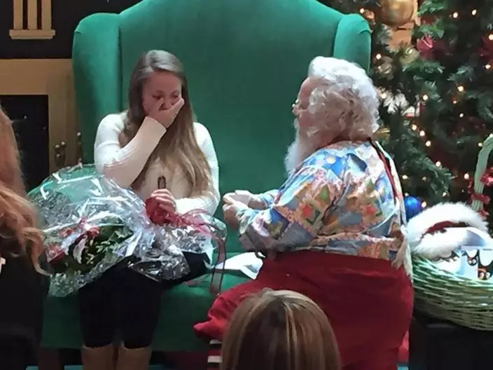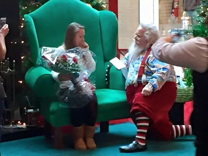 就在這個時候,聖誕老人突然拿出一束鮮花單膝跪下讀出求婚宣言,並拿出戒指,請Kimberly嫁給Clint。
