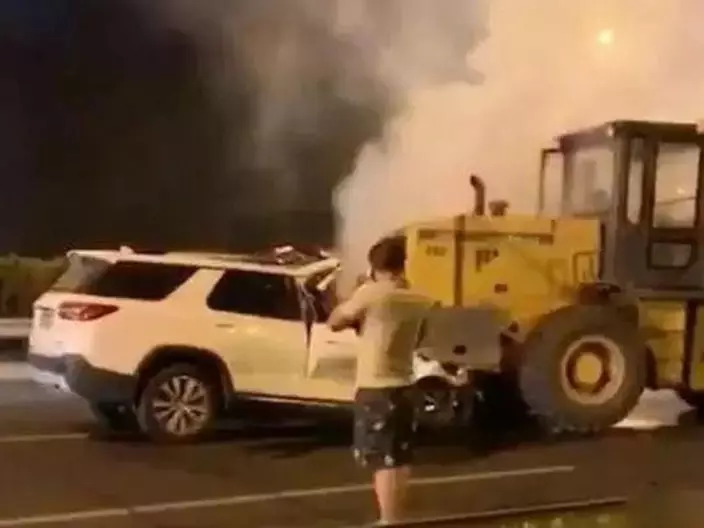 事發後,目擊者拍攝的現場影片引發關注。在幾段十幾秒鐘的短片裏,一輛白色SUV與一輛鏟車追尾,白色SUV的車頭嵌進鏟車尾部,被擠壓變形,鏟車司機站在車旁打電話。現場的拍攝者一邊舉著手機拍攝,一邊催促鏟車司機駛開鏟車,鏟車司機卻並未行動,隨後白色SUV前部冒白煙、起火,大火很快將車輛吞噬。