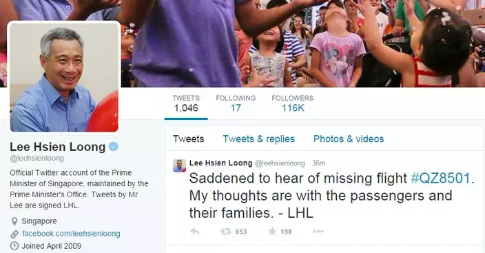 新加坡總理李顯龍亦在Twitter發文,就亞航失蹤致哀。