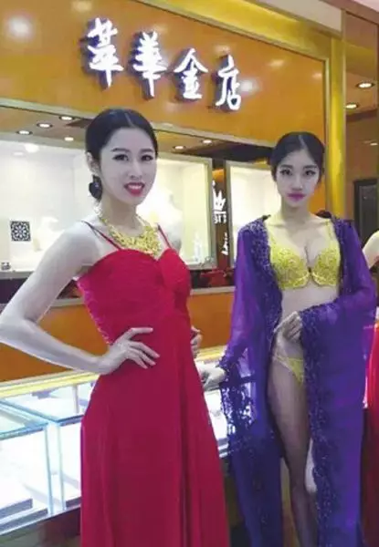 溫州一個商場的一間新開張的金舖請嫩模穿戴公司特製產品,其中一名美女模特兒身著「黃金比堅尼」亮相,吸引逾百人圍觀。金鋪內外水泄不通,連商場通道都一度被堵塞。不少男顧客高舉手機拍照留念,爭相逼入店內一睹模特兒芳容。