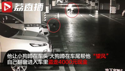 當時一名男子帶著兩條狗在車庫散步,在看到有輛車車窗沒關後,他讓小狗蹲在車頭,大狗蹲在車尾,自己翻進車窗盜竊。拿了東西後,帶著兩條狗離開。