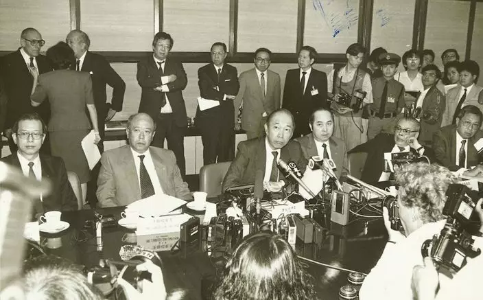 1987年,源自美國的全球股災爆發,香港更罕有地停市四天,股匯市場為之震動。圖為當時的聯交所主席李福兆(中)舉行記者會講解停市決定。