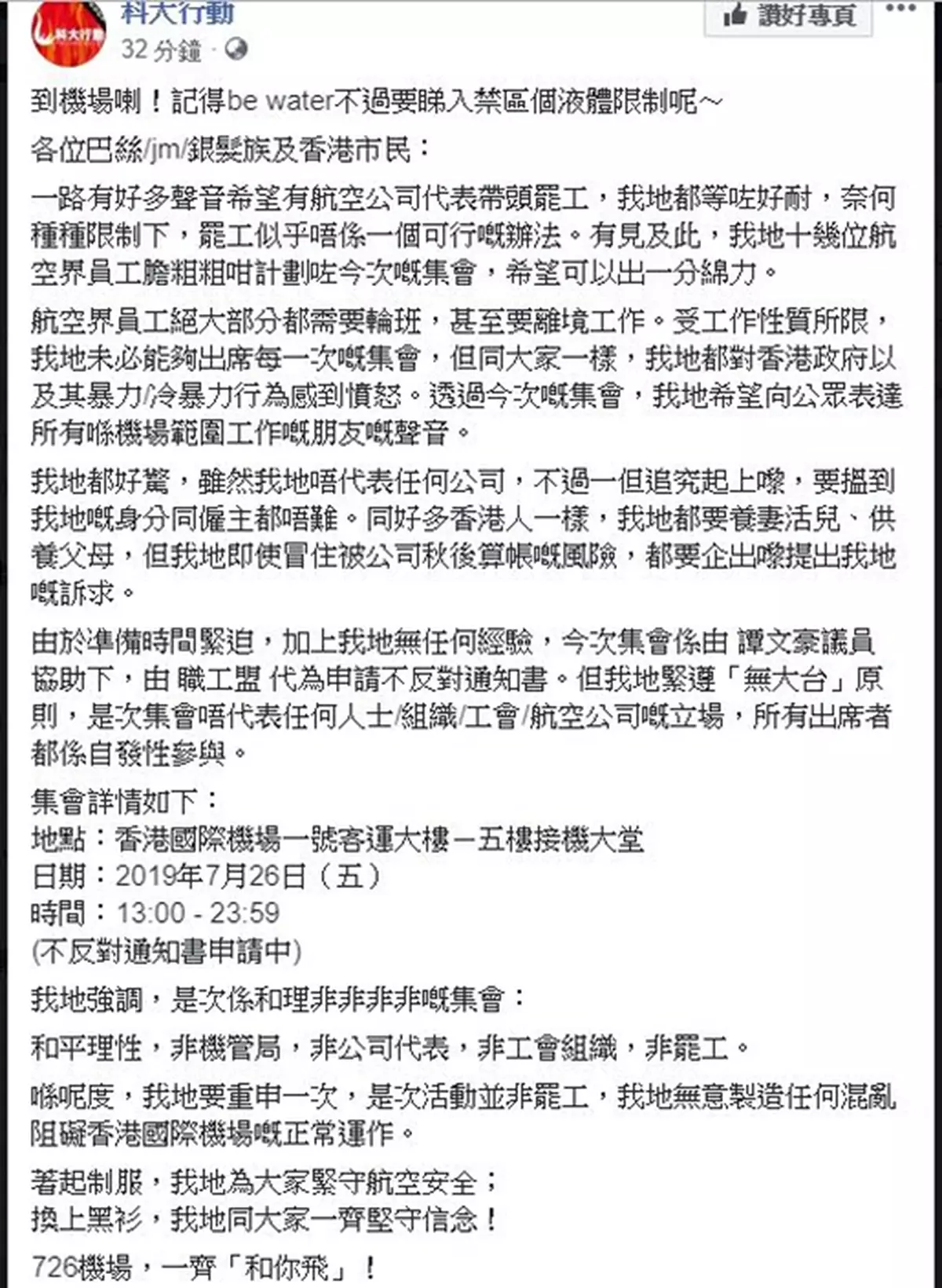 他們直言,雖然是次集會不代表任何公司,但若追究時,不難找到其身分及僱主,但強調即使冒著被公司秋後算帳的風險,亦要站出來提出訴求。他們又指,是次集會由 立法會議員譚文豪協助,並由職工盟代為申請不反對通知書,但遵守「無大台」原則,是次集會不代表任何人士、組織、工會、航空公司的立場,並指所有出席者均是自發性參與,並重申為「和平理性,非機管局,非公司代表,非工會組織,非罷工」。