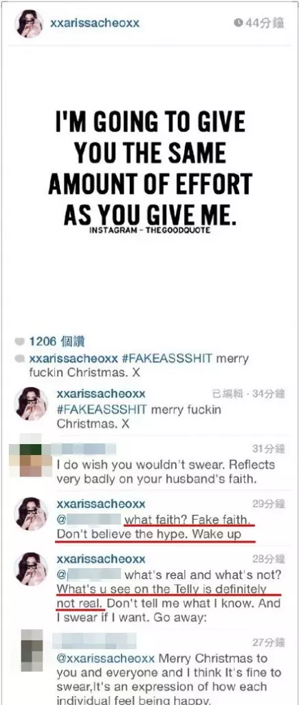 事緣石貞善近日在Instagram貼出一張相,爆粗留言「#假的要死,***聖誕節快樂!(#FAKEASSSH*T merry f**king Christmas!)」有網民留言指這樣對她老公的信仰不尊重,她回應說:「什麼信仰?假的信仰!別相信這騙局,清醒吧!」隨後更繼續炮轟:「What's u see on the Telly is definitely not real.(你在電視上看到的都是假的。)」
