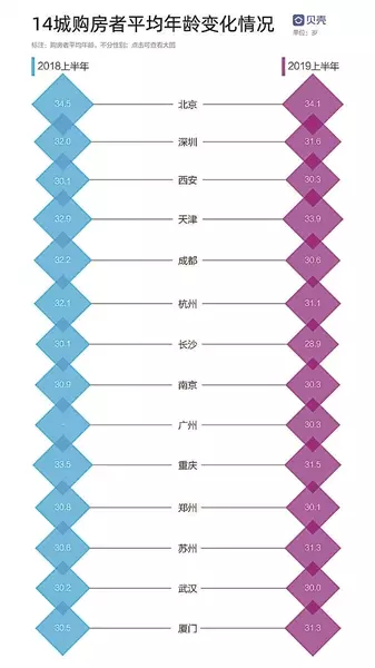 報告重點觀測的城市中,北京、重慶、成都等9個城市的二手房購房者,平均年齡越來越趨於年輕化。其中,長沙購房者最年輕,平均為28.9歲,而重慶購房者的年齡降幅最大,較2018年上半年足足提前了兩年,達到31.5歲。另外,北京、深圳的購房者平均年齡仍然較高,但與2018年上半年相比,購房者平均年齡在降低。報告數據顯示:2019年上半年,北京購房者平均年齡約為34.1歲,深圳購房者平均年齡約為31.6歲。