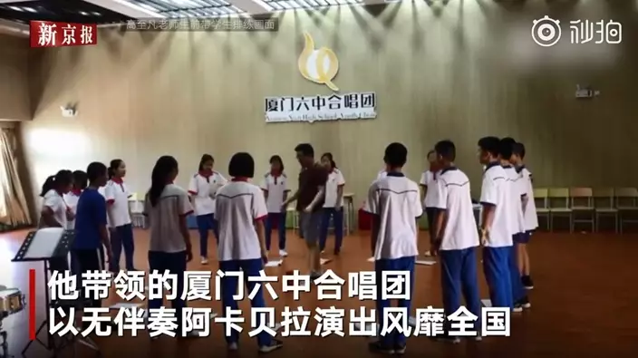 廈門一名中學老師熱愛無伴奏合唱,他帶領學校合唱團拿下不少學屆獎項,又出席全國公開表演,可是他日前突然因急病而猝死,無法帶領合唱團再走下去。他的學生特意到殯儀館合唱《夜空中最亮的星》,為他獻上最後的致意。在場人士無不感動落淚,場面感人。