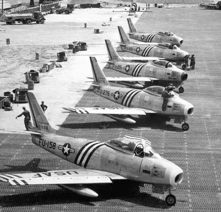 蘇聯的米格-15和美國的F-86「佩刀」,二者皆脫胎於德國的技術。二戰德國戰敗投降後,美、蘇都獲得了大量德國的秘密研究成果,諸如噴氣推進、火箭發動機和彈道導彈等,特別是噴氣式戰鬥機,德國航空工程師戰時已用風洞測試過了當時人類所能設想的所有氣動外形。正是在德國的研究基礎上,美、蘇兩國分別設計出更先進的噴氣式戰鬥機並成規模投入到朝鮮戰場,開啟了噴氣式飛機空戰的時代。