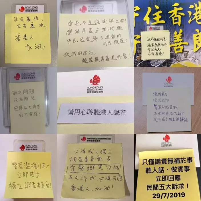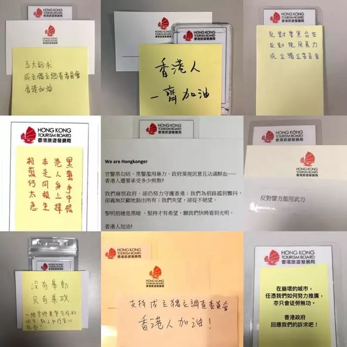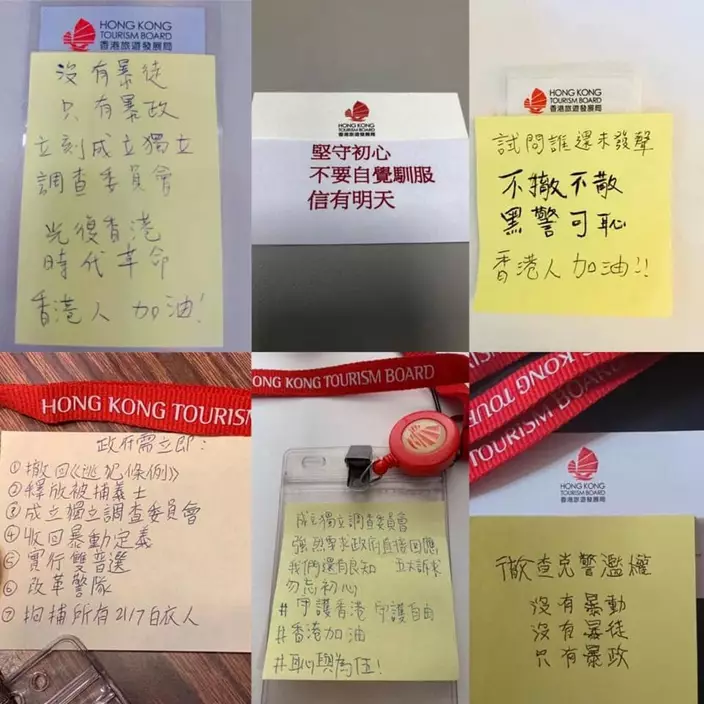 逾80名旅發局職員貼上其工作證件的照片,並參與聯署。信中表示,在過去兩個月,「我們見到我們熱愛的香港變得不一樣──數以百萬計市民接連走上街頭,表達反對《逃犯條例》修訂,甚至有市民以死相諫,但依然得不到政府的正面回應,反以「暫緩」、「壽終正寢」等語言偽術,企圖蒙混過關」。信中又指,政府縱容警方濫用暴力,以催淚彈、布袋彈、橡膠子彈及海綿彈等對付示威者、記者及議員,令整個香港徹底撕裂。