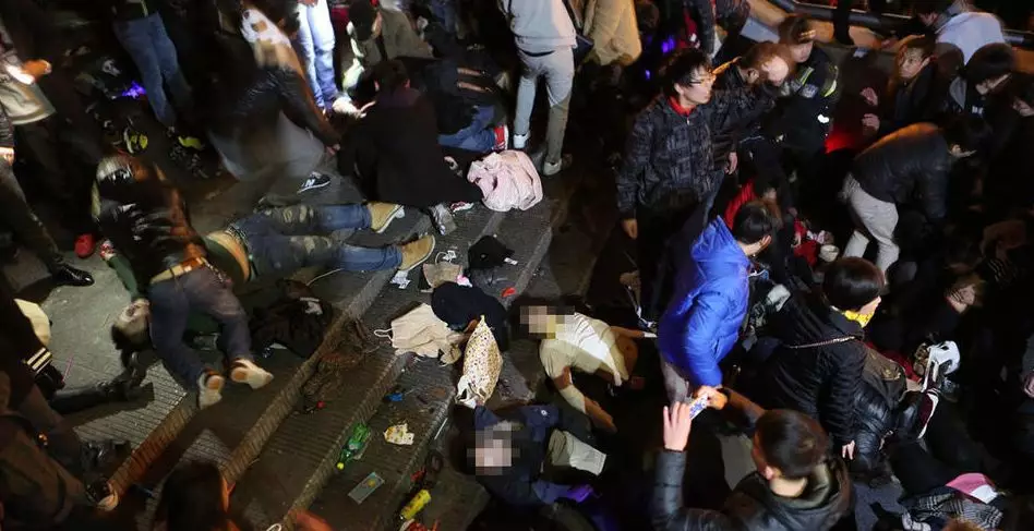 殷女士表示, 「嫂子18歲的孩子走在前面,當中兩個小孩跟著,我護在中間,我兒子跟在我後面,然後是我哥哥嫂子。」殷女士回憶說,「當時人特別擠,所以我們幾個幾乎是一條直線在走。當時不知道誰喊了幾聲,然後在台階上就有幾個小年輕在那裡起哄擁擠。本來台階上就擠滿了人,平台上的人想下來,下面馬路上的人想上去,我們被擠在當中。很快就有女孩子摔倒、尖叫,然後人就這樣一層層倒下去。」