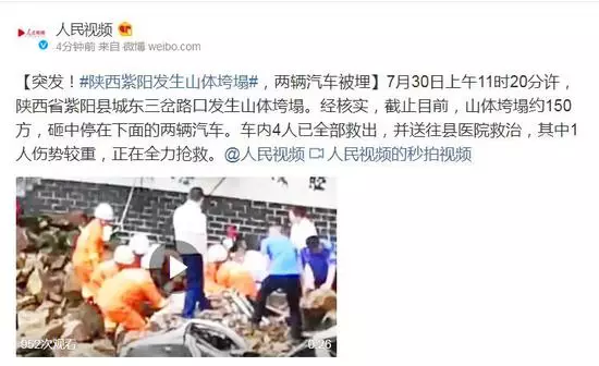 【突發!#陝西紫陽發生山體垮塌#,兩輛汽車被埋】7月30日上午11時20分許,陝西省紫陽縣城東三岔路口發生山體垮塌。經核實,截止目前,山體垮塌約150方,砸中停在下面的兩輛汽車。車內4人已全部救出,並送往縣醫院救治,其中1人傷勢較重,正在全力搶救。