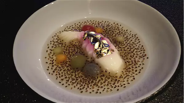 作為甜品的奇異果露伴奶香果凍丸子,以甜美的金魚奶凍為主角,加上各種小丸子和奇異果籽,為套餐劃上蜜甜的句號。
