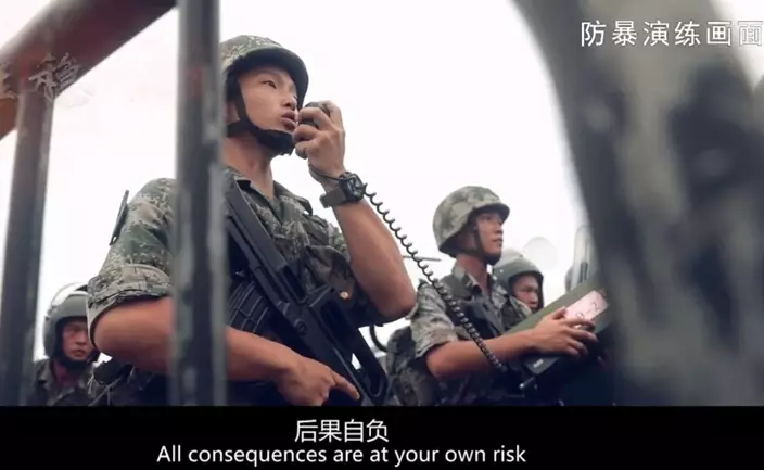 防暴演練的畫面中有解放軍以廣東話大喊「後果自負」。影片截圖